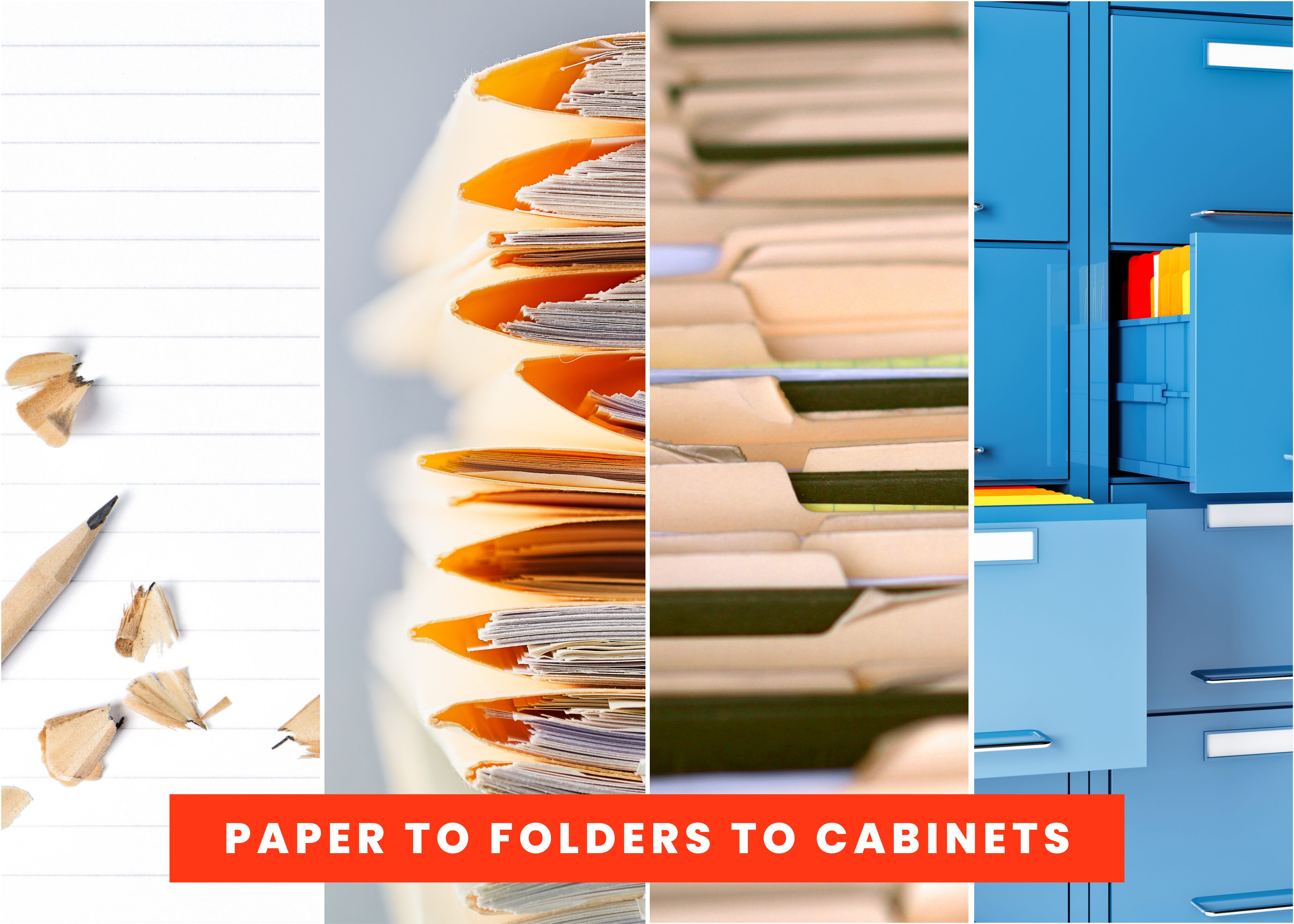Next we have the same issue with the folders themselves that we had with the single sheet of paper. The manilla folders can only reside in a single hanging folder, and those hanging folders can only be placed in one drawer of one filing cabinet.