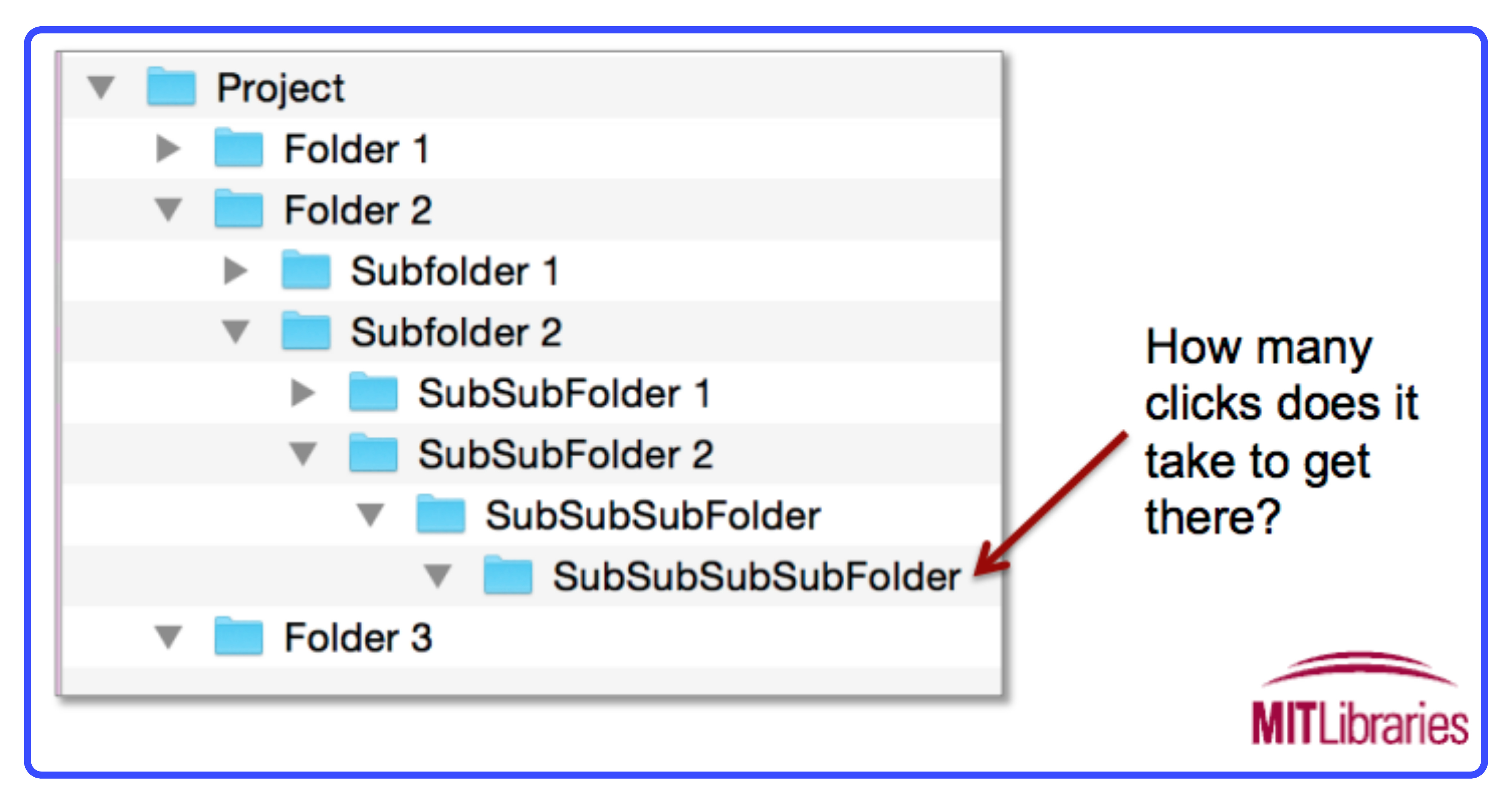 Traditionally, electronic documents recreate the conditions of paper storage. Look at your desktop folders. With the exception of creating an Alias for a document or folder, they're playing by the rules of paper and filing cabinets. It ends up looking something like this — folders within folders within folders. While helpful to our adoption of digital document storage, there are other options.